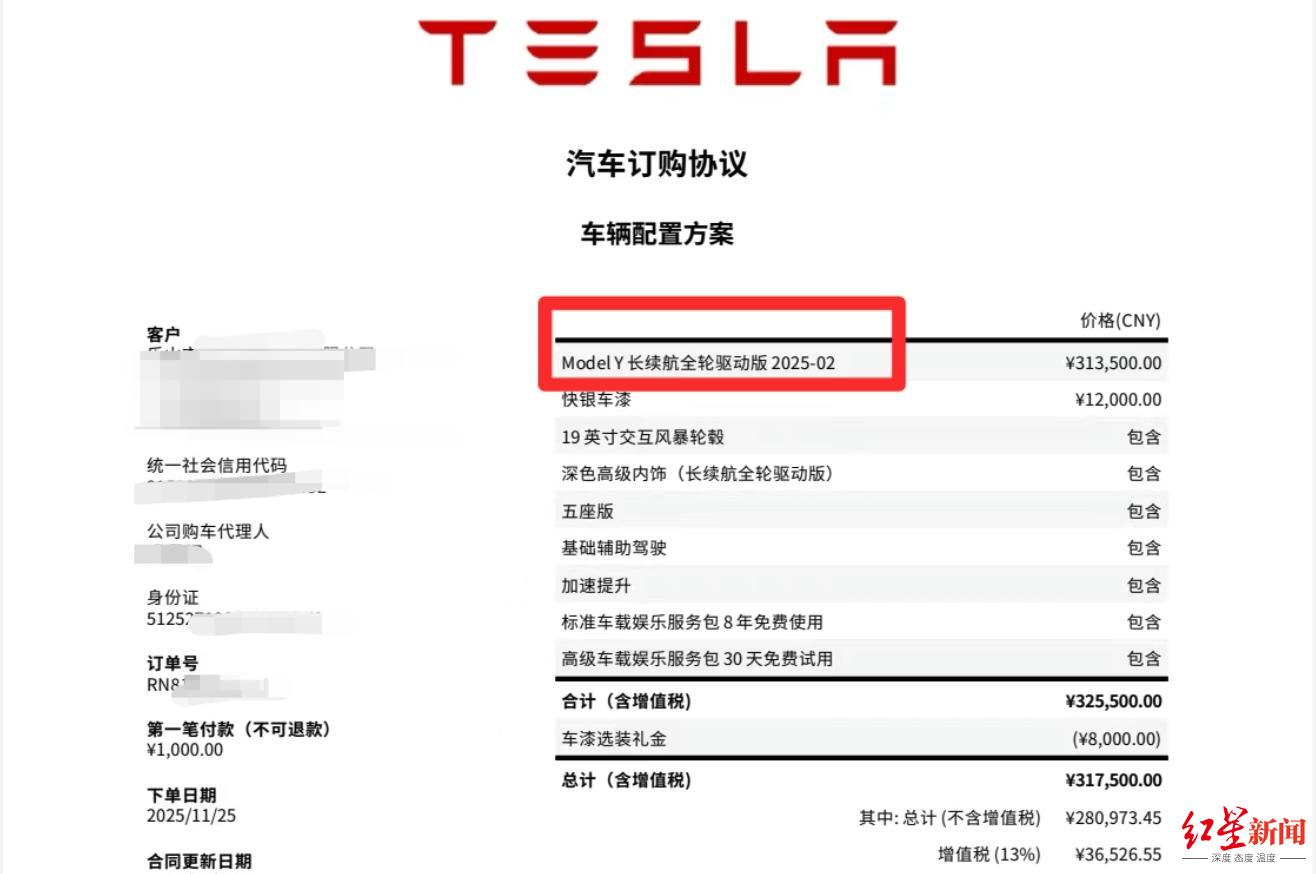宋女士表示,她以前买过多辆车,一般都会有纸质购车协议,需要消费者签字确认,但这次买特斯拉却是销售人员录入信息,生成电子版协议,后续也没有让消费者确认的环节。“即使我看了协议,销售人员没讲过,作为普通消费者又怎么知道2025-02是什么意思?又怎么会想到11月底下单买的却是7月份升级之前的老款车呢?”